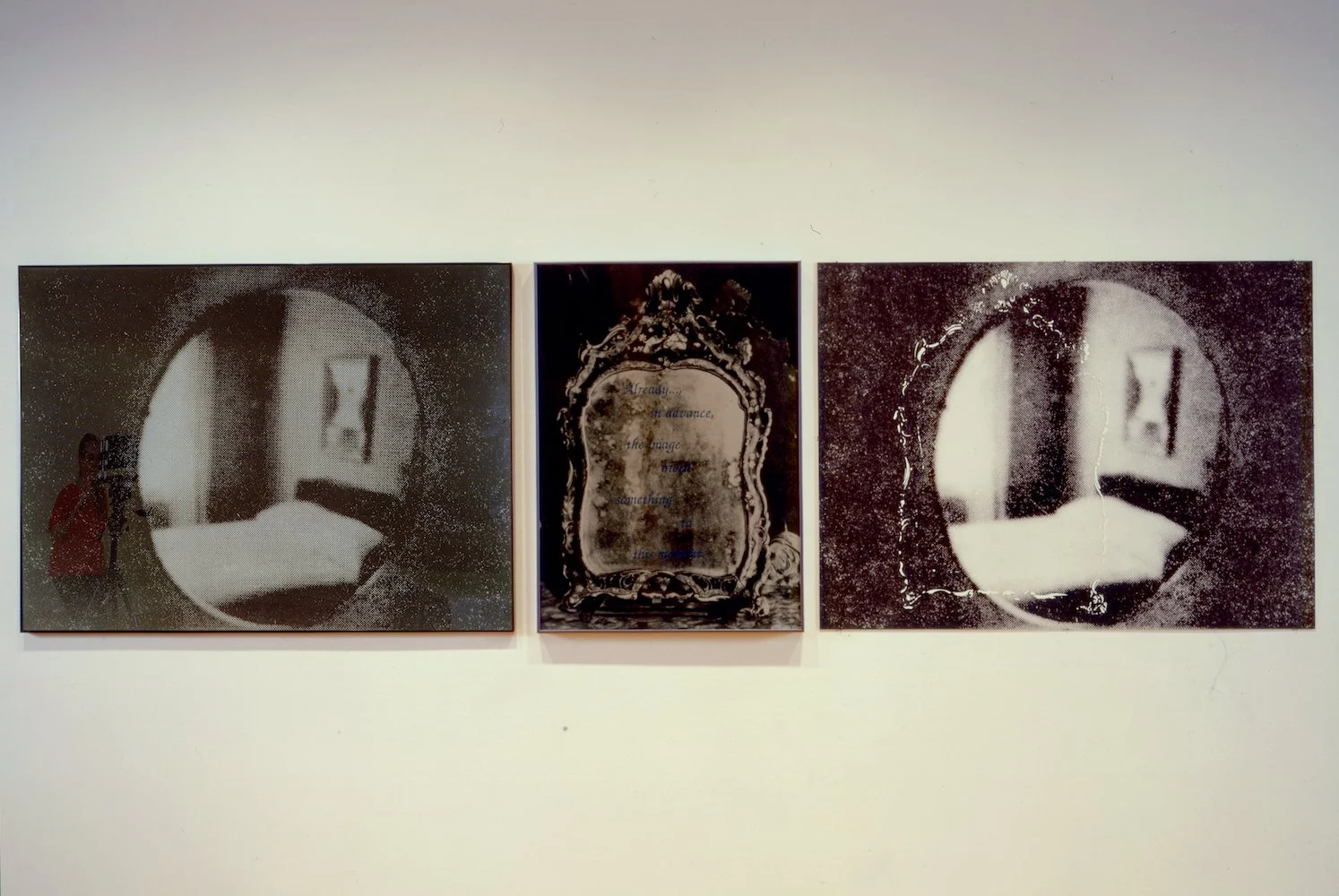 b) A cibachrome made from a photograph taken by photographer Cheryl O'Brien of the plexiglas-covered photostated film still. Her image, reflected in the plexiglas as she shoots the photograph, is seen in the lower left corner.