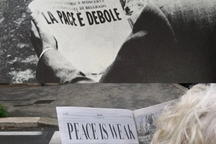 Placed below this is a photograph of the back of a man reading a newspaper dated April 25, 2022 at a cafe in Rome. A transparent still from Antonioni’s film La notte (1961) has replaced the previous image. The headline has been altered to read “After Politics.” The text added to the page on the right is the meditation 4:3 from The Meditations of Marcus Aurelius. “This world is change; this life, opinion.”