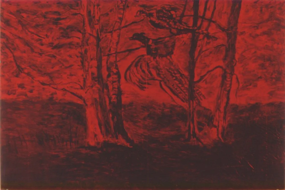I asked Arlene Stamp to give me one of her paintings from the series of paintings she did based on colour Xerox copies of paintings by amatuer painter Gladys M. Johnston. I placed a sheet of red Plexiglas over her painting that acted as a filter, changing its original colours and texture. The Plexiglas bonded to the wax medium in the painting and cannot be removed without causing damage to its surface.