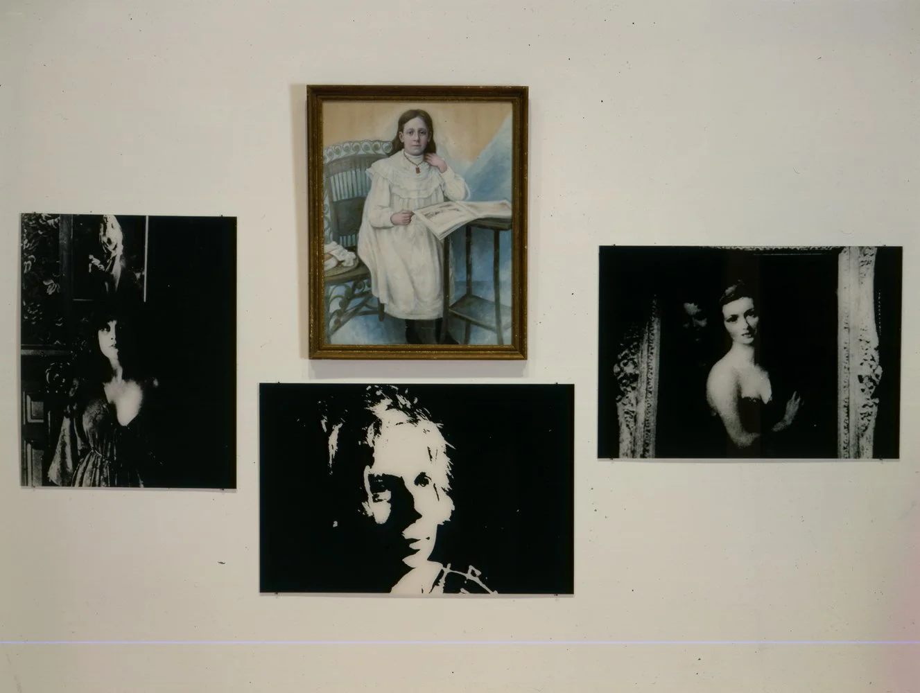 b) A photostatic enlargement of a black & white photograph of me placed below the painting of my grandmother.