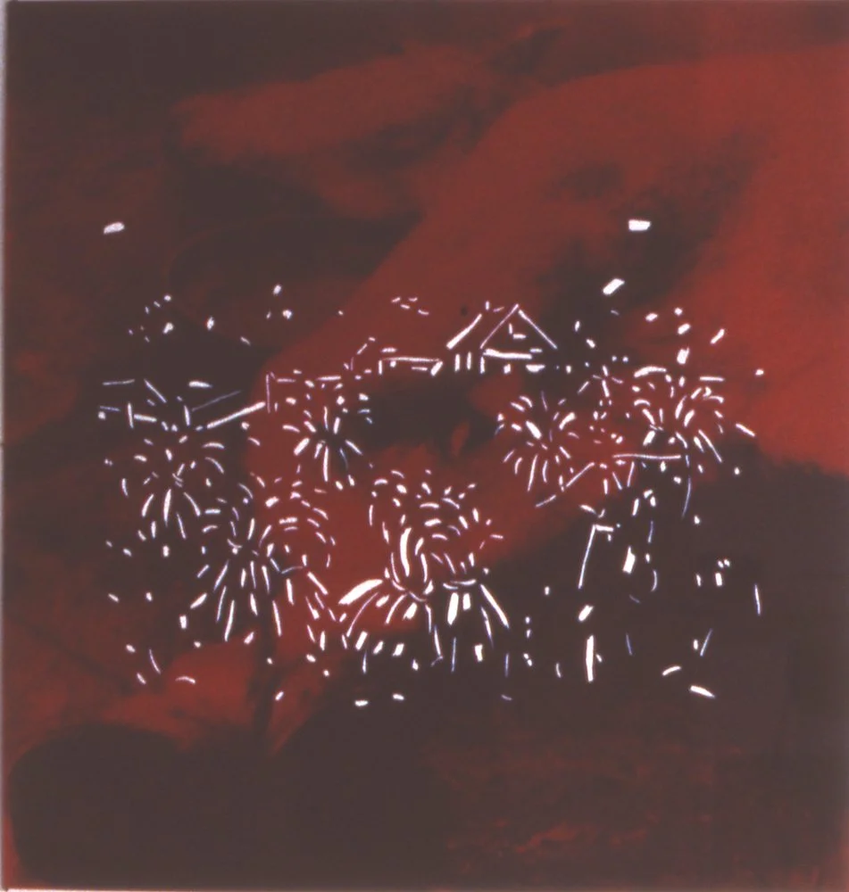 I used white acrylic to trace selected brush marks from a thrift store painting of a harvest scene onto a sheet of red Plexiglas. I overlayed the Plexglas onto the photostat of the film still.