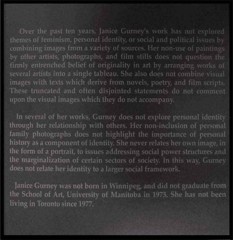 This work is the negative version of the Didactic Panel written by the education department at the Winnipeg Art Gallery.