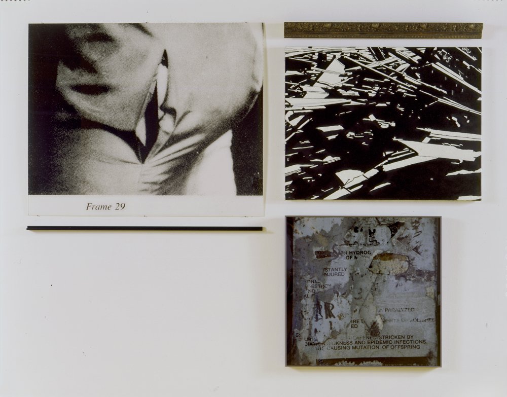 49" x 65" installed; cibachrome, photostat, plexiglas, metal frame, wood frame, oil on acrylic painting.